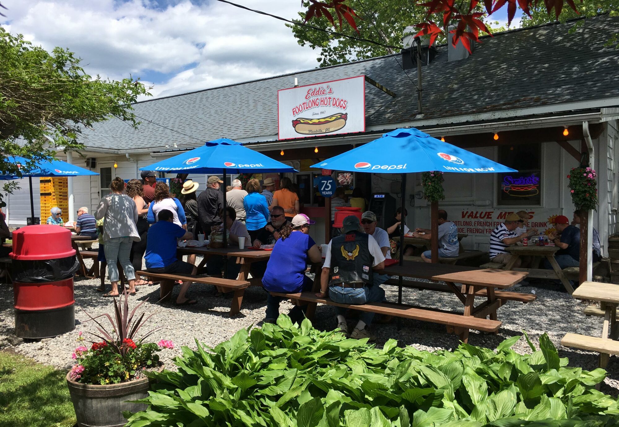 In 1958, Route 322 was being widened to four lanes, so the hotdog stand had to relocate to the Harmonsburg Road for 18 months while Conneaut Lake Road was closed. When the road finally re-opened, Eddie bought the property where the business is currently located today. The founding Johnson's retired in 1988 when the couple turned over their secret sauce recipe and the keys to the roadside stand to their son and daughter-in-law, Eddie and Jose' Johnson, who had been working there for more than 20 years. In 1991, Eddie and Jose decided to make a switch and start purchasing their footlong hotdogs from a local favorite, Smith's Provision from Erie, PA. They are also a family owned and operated business that takes pride in quality products. The switch proved to be a good one. In 2001, Eddie's Footlong celebrated selling their 1,000,000 Smith's brand footlong hotdog. How many footlongs were sold in the years prior to the switch is just a guess.